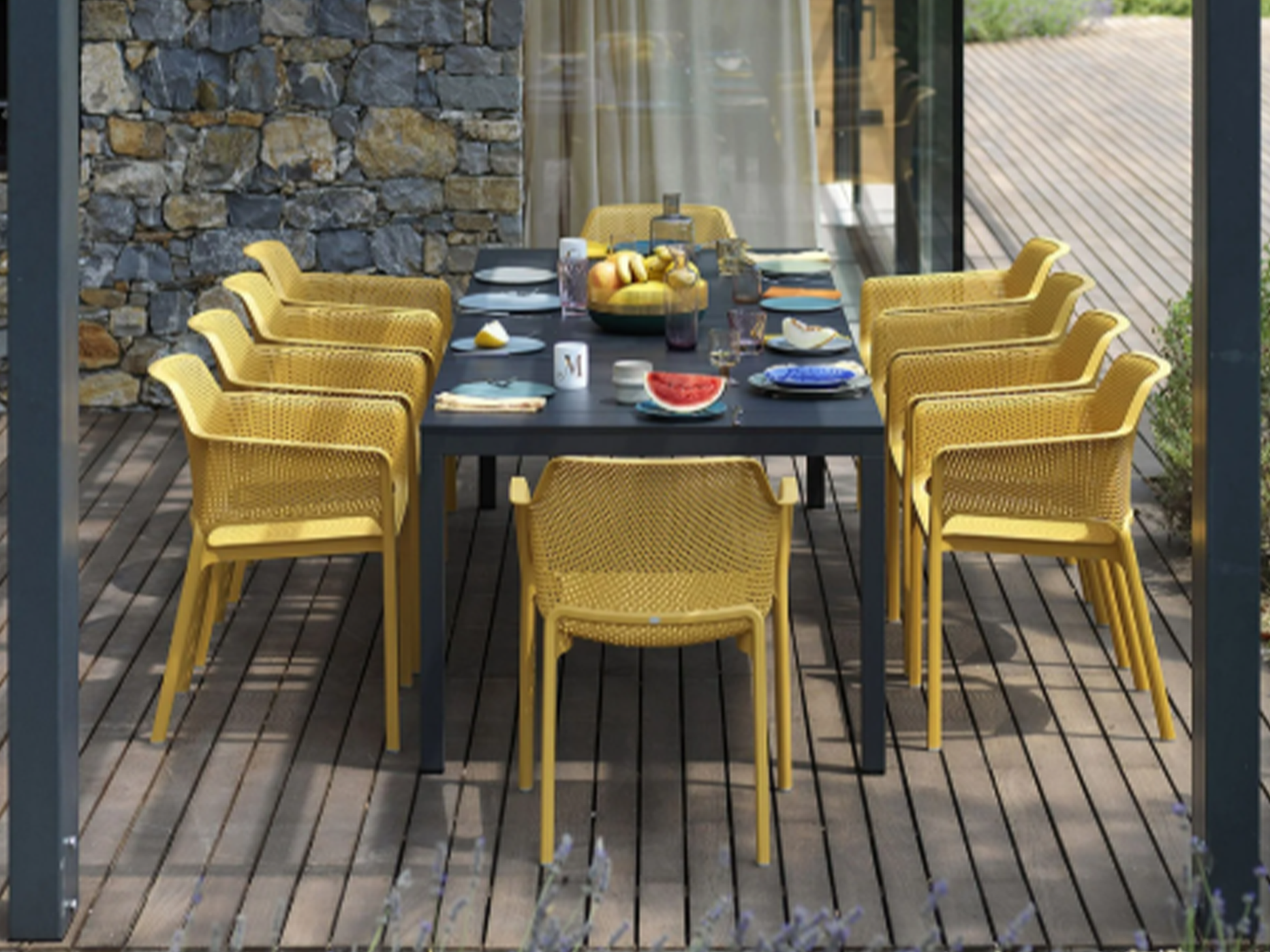Relaxation raffinée pour Net, monocoque en résine fibre de verre soigneusement criblée de motifs à fleurs carrées et rayonnantes réparties régulièrement sur la surface tridimensionnelle de l’assise. Empilable.